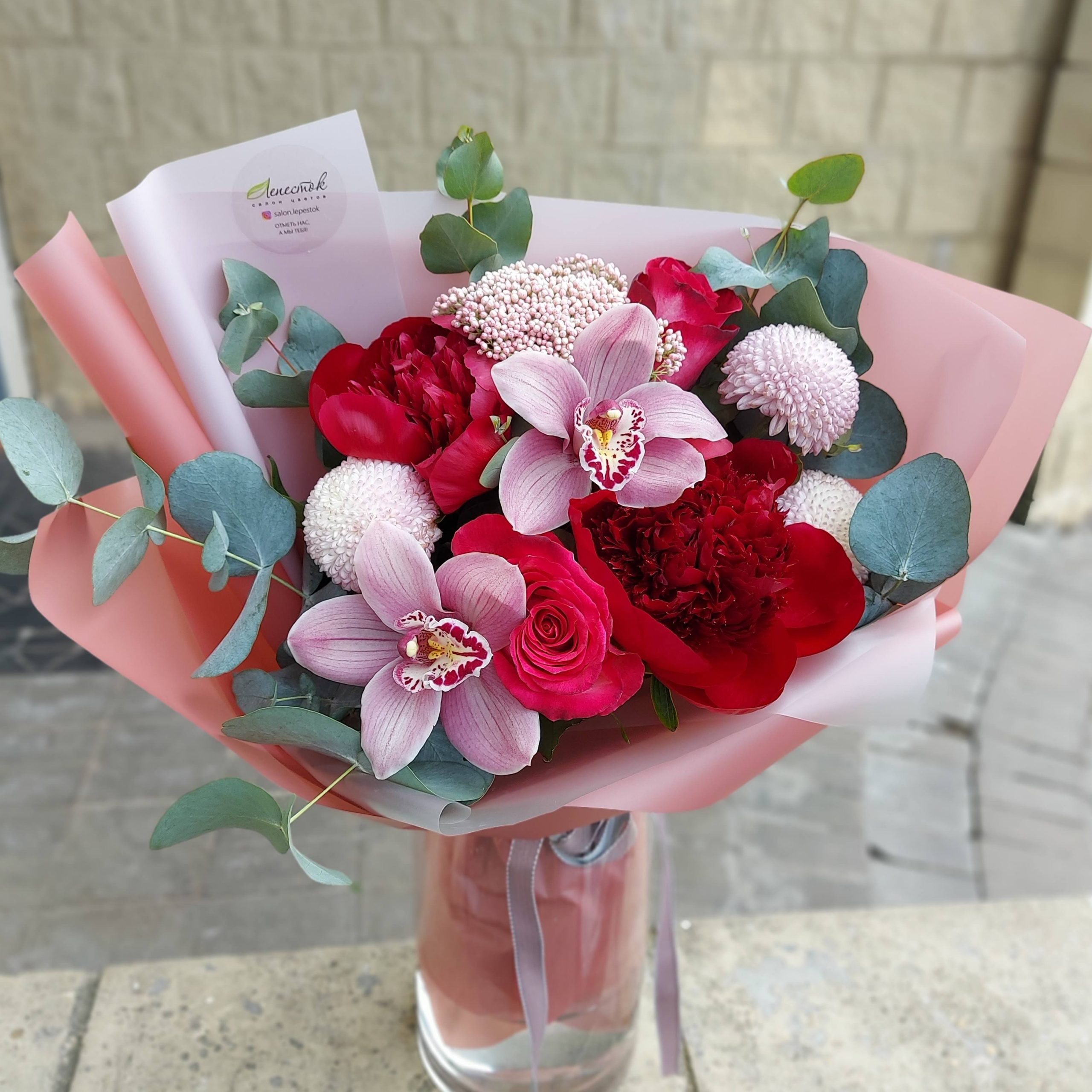 15 пионов с эвкалиптом
