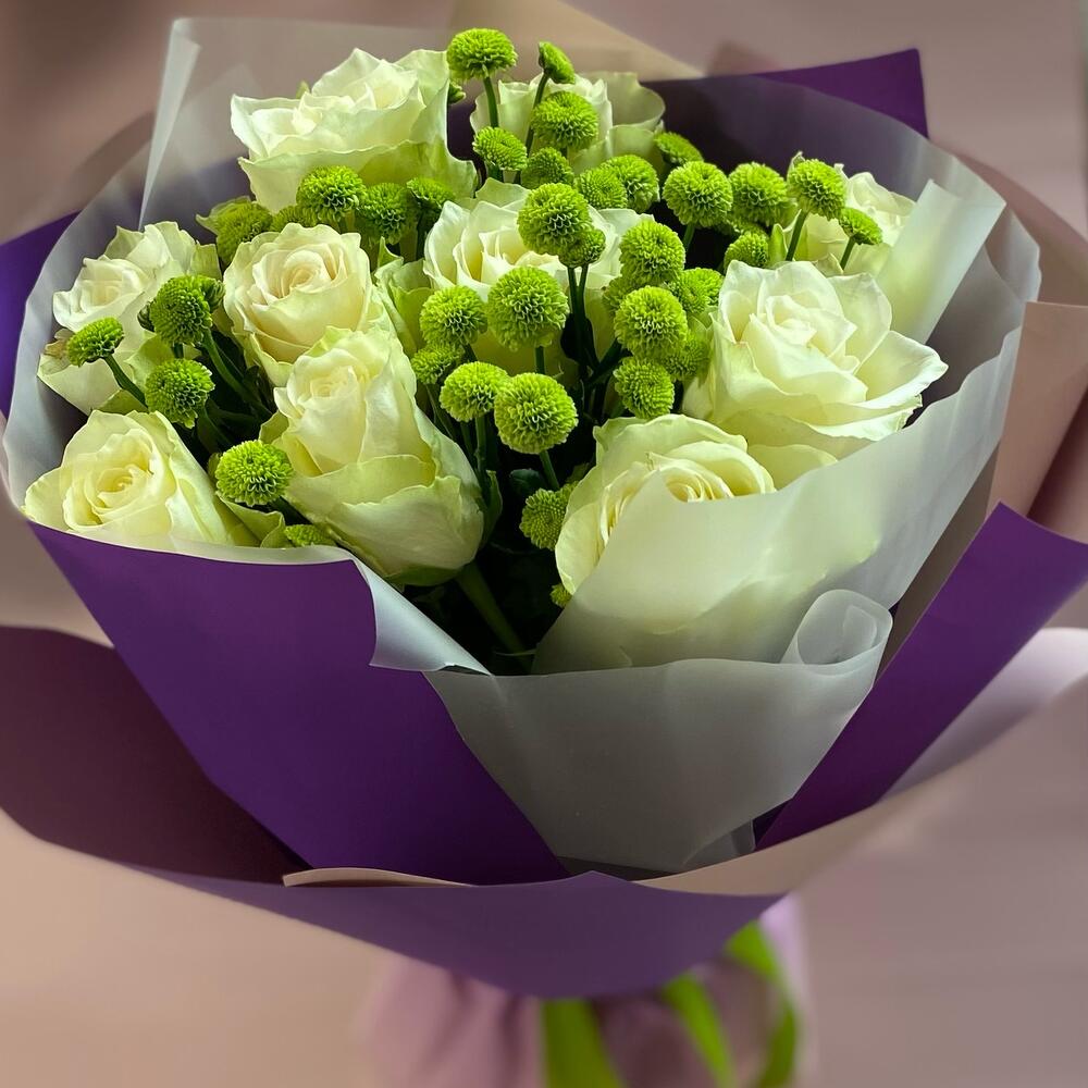 Роза Кенийская – 10 шт.сантини помпон – 5 шт.Упаковка дизайнерская – 2 шт.