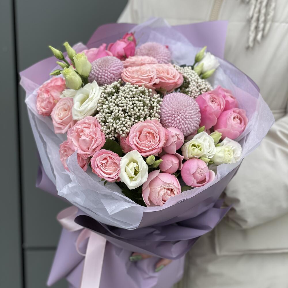 Эустома – 3 шт. Хризантема момоко – 3 шт. Озотамнус – 2 шт. Кустовая пионовидная роза – 3 шт. Кустовая роза Бомбастик – 3 шт. Оформление – 1 шт.
