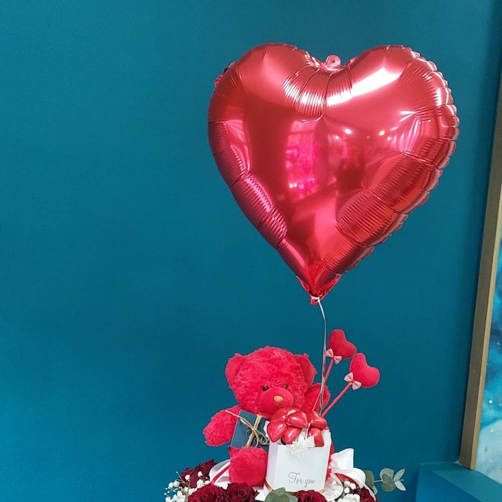 Роза – 11 шт. Гипсофила – 2 шт. Эвкалипт – 1 шт. Медведь плюшевый – 1 шт. серца серца – 1 шт. Коробка шляпная – 1 шт.