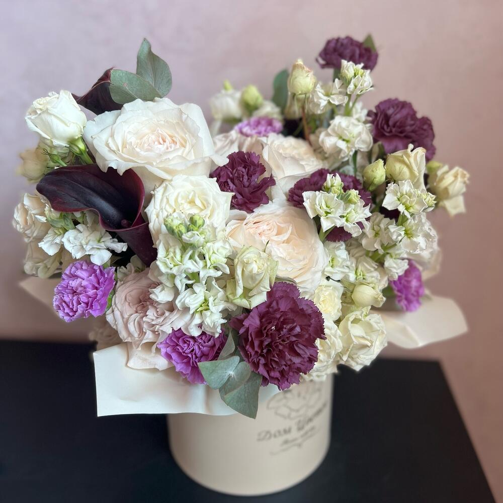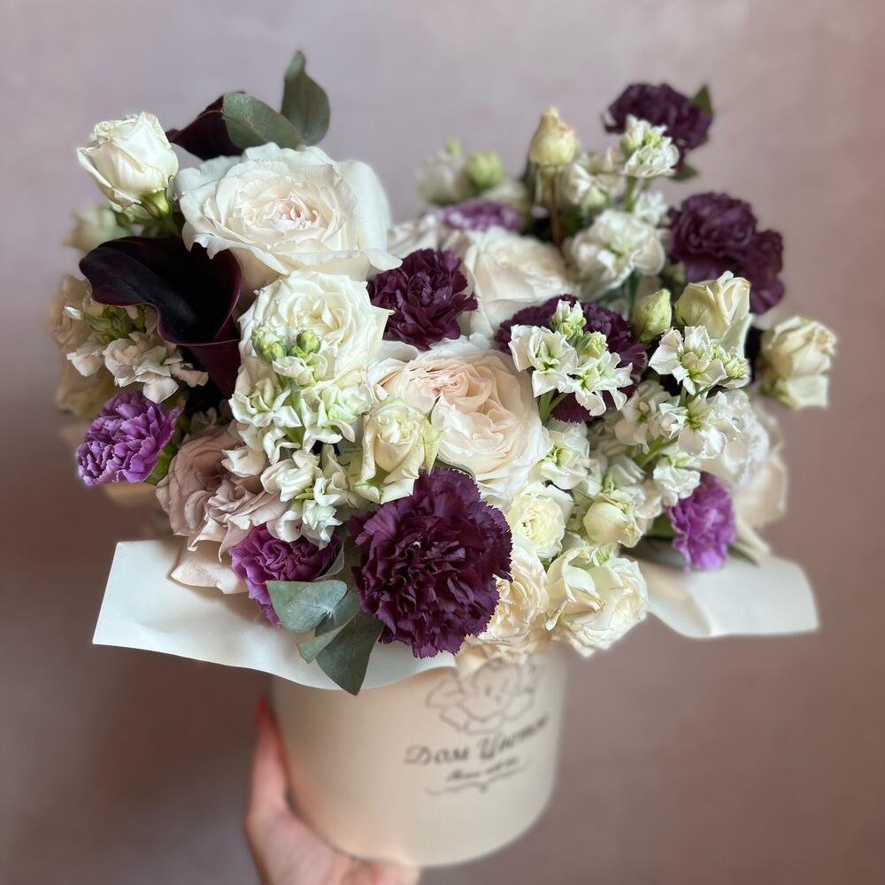шляпная коробочка m – 1 шт.Флористическая губка – 1 шт.Гвоздика – 11 шт.Маттиола – 5 шт.Лизиантус – 2 шт.Кустовая роза – 3 шт.Калла – 5 шт.Пионовидная роза – 10 шт.Эвкалипт – 2 шт.