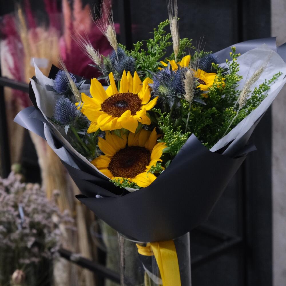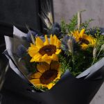 Солидаго – 3 шт.Эрингиум – 2 шт.Подсолнух – 3 шт.Пергамент – 1 шт.упаковка (пленка – 1 шт.лента) – 1 шт.колосья (сухоцвет) – 7 шт.