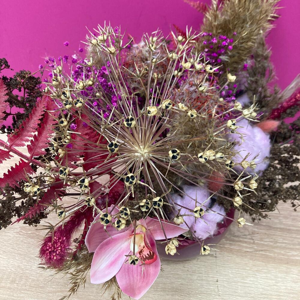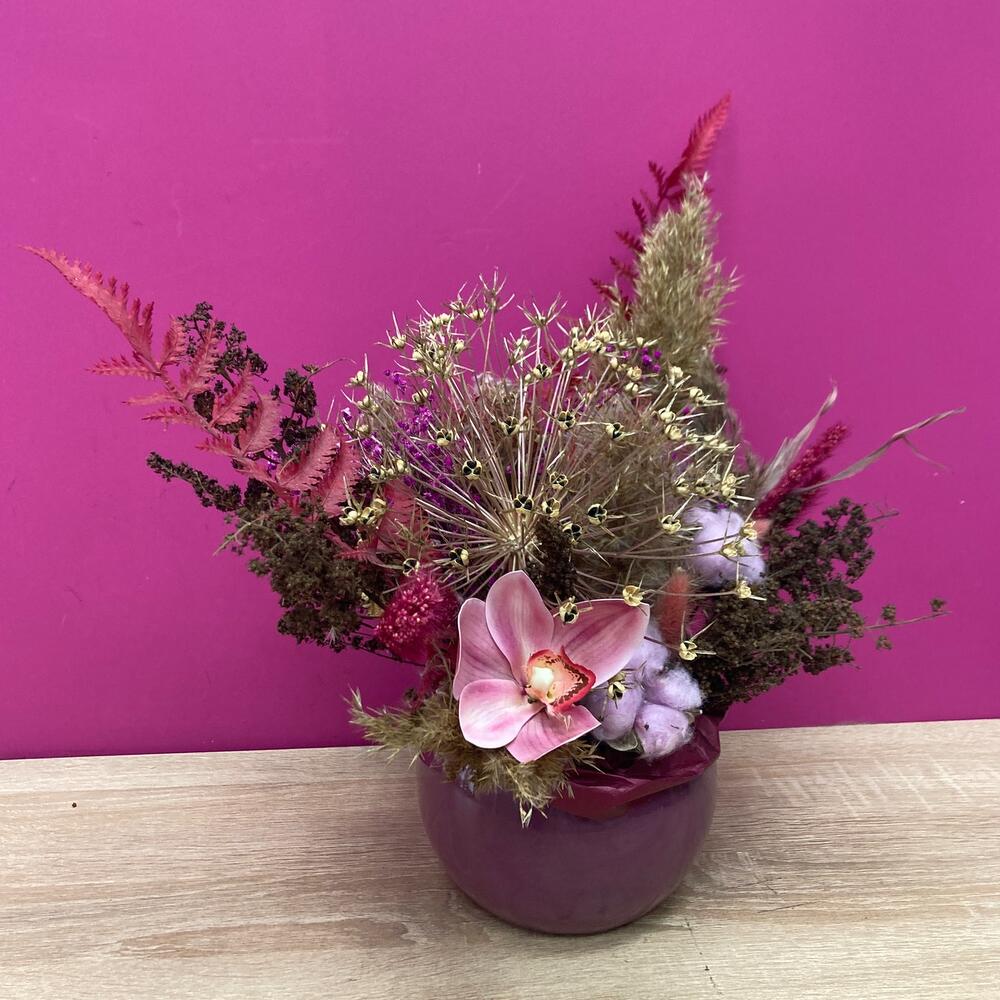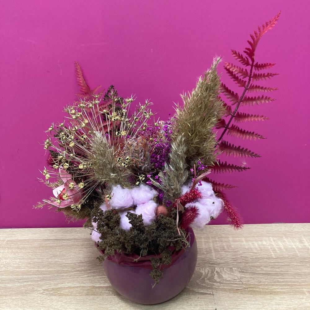 хлопок крашеный – 3 шт.Орхидея искусственная – 1 шт.Лагурус (сухоцвет) – 3 шт.злаки сухоцвет – 3 шт.злаки красные сухоцвет – 3 шт.гипсофила сухоцвет – 2 шт.леукоспермум сухоцвет – 2 шт.экзотический сухоцвет – 6 шт.папоротник искусственный – 2 шт.Оазис для сухоцветов – 1 шт.Кашпо керамическое – 1 шт.